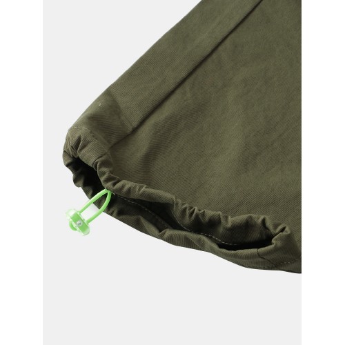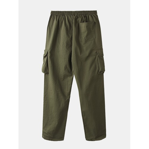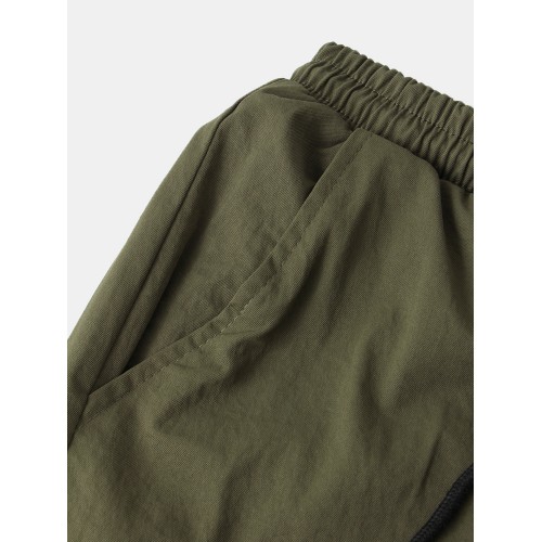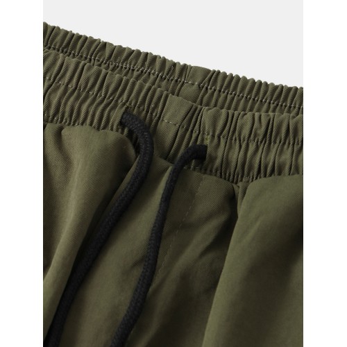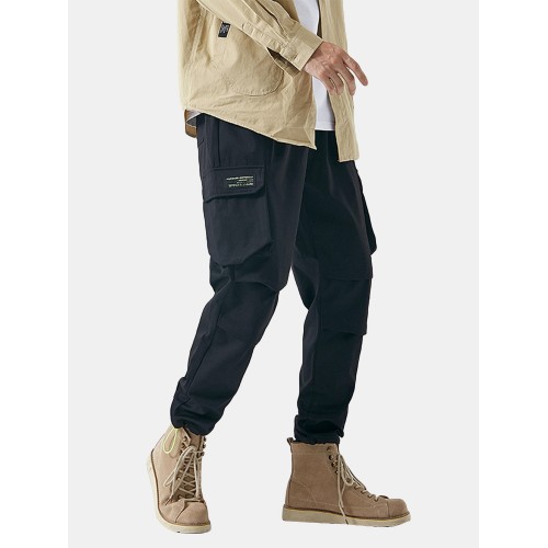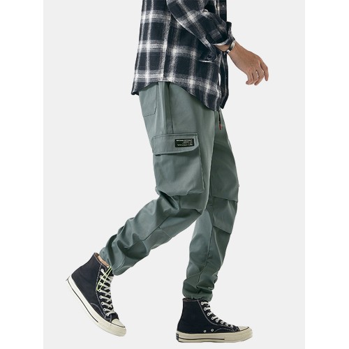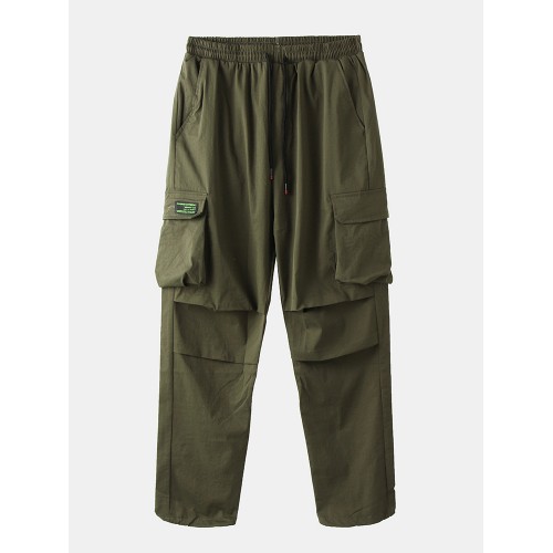 Mens Solid Applique Cotton Drawstring Cuff Cargo Pants With Multi Pockets