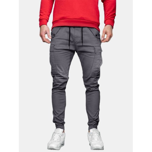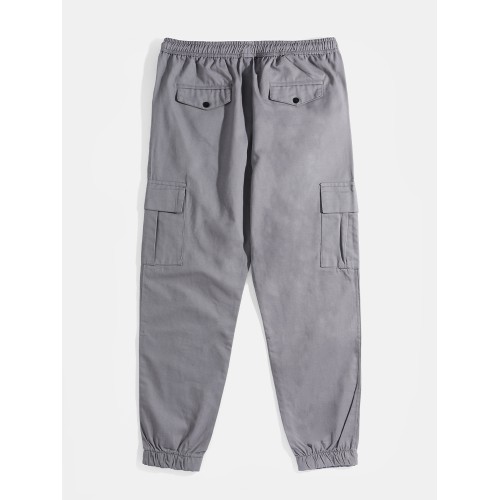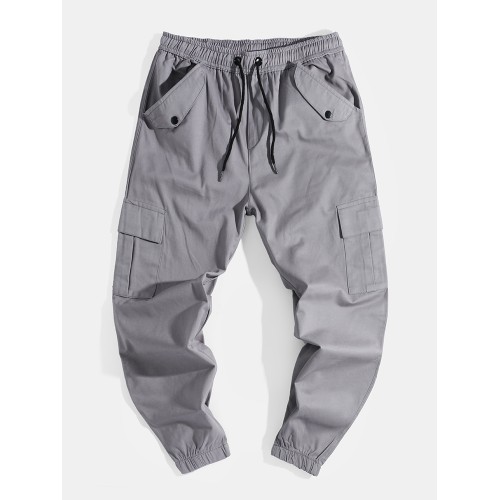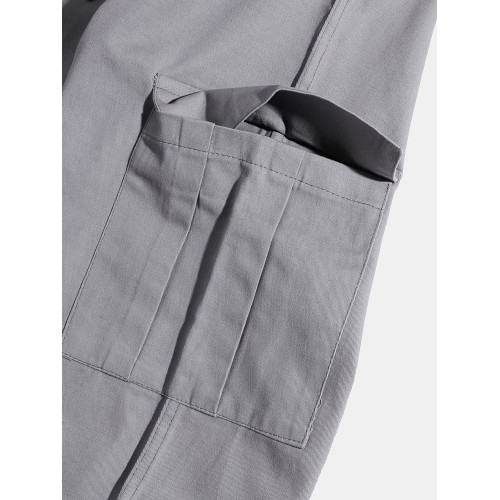 Mens Solid Color Drawstring Mid Waist Overalls Pocket Cargo Pants