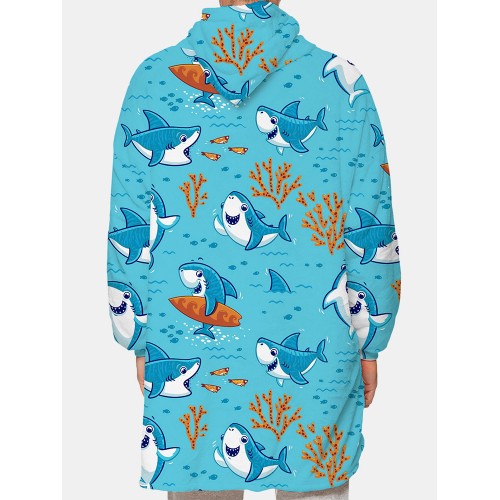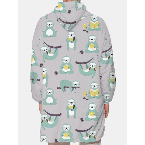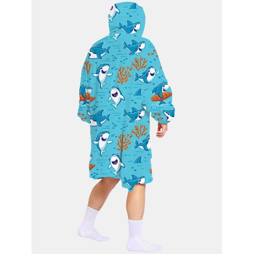 Mens Cartoon Animal Print Reversible Oversized Blanket Hoodie Home Sleepwear Robes With Pocket