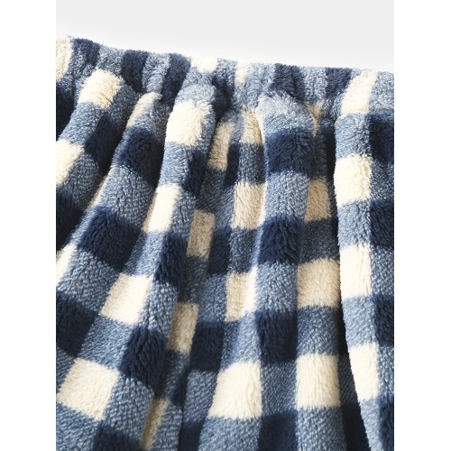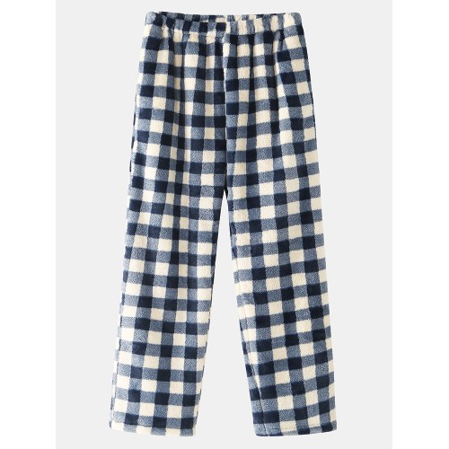 Mens Check Flannel Thicken Warm Elastic Waist Home Sleep Bottoms With Pocket
