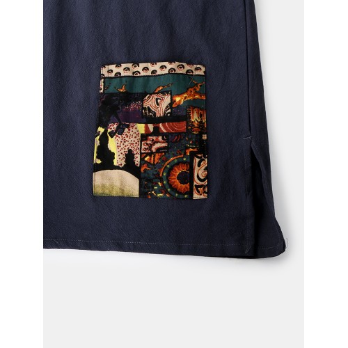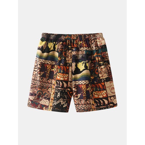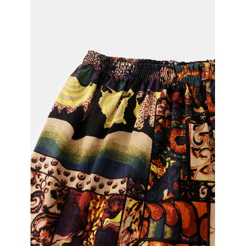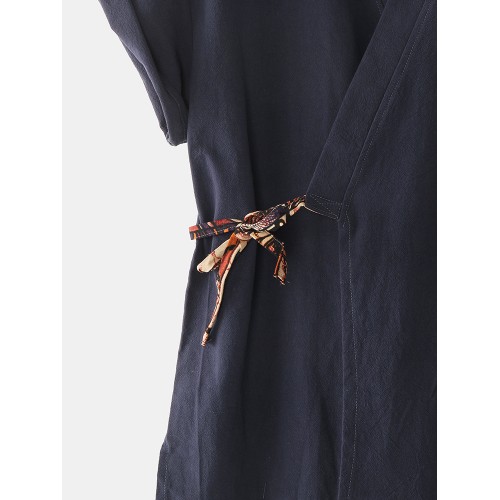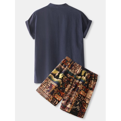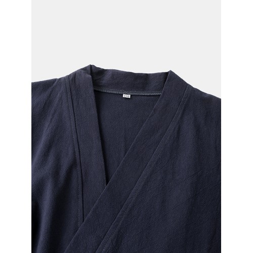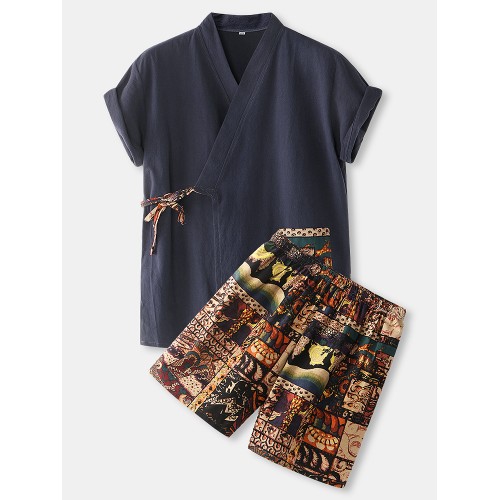 Mens Cotton Vintage Print V Neck Tie Side Kimono Relaxed Fit Short Pajamas Sets